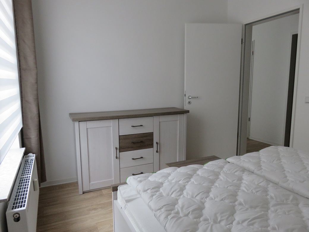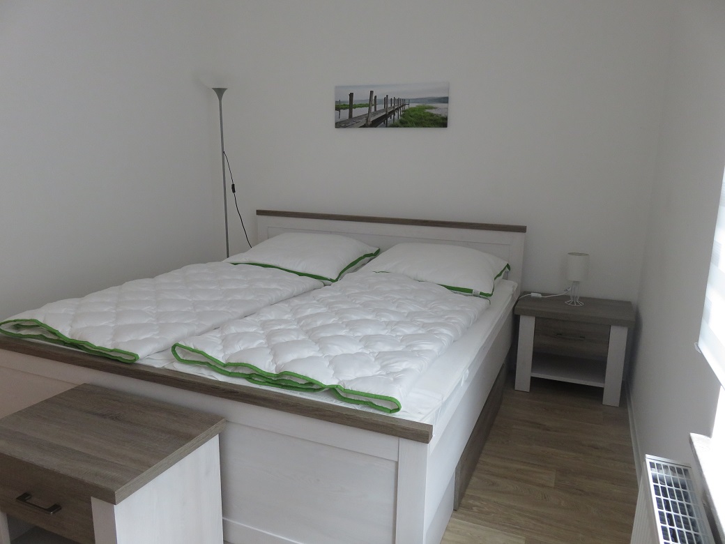Das Schlafzimmer bietet ein Doppelbett zur Übernachtung und eine kleine Kommode.