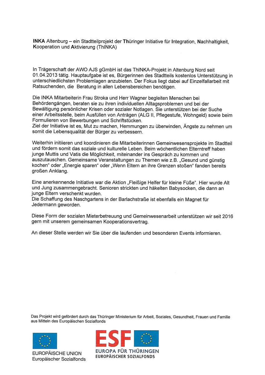 Seit 2015 besteht eine Kooperationsvereinbarung zwischen der Arbeiterwohlfahrt Alten-, Jugend- und Sozialhilfe gemeinnütziger Gesellschaft (AWO AJS gGmbH) und unserer Genossenschaft zur Durchführung und Unterstützung des ESF-Projektes ThINKA Altenburg Nord.